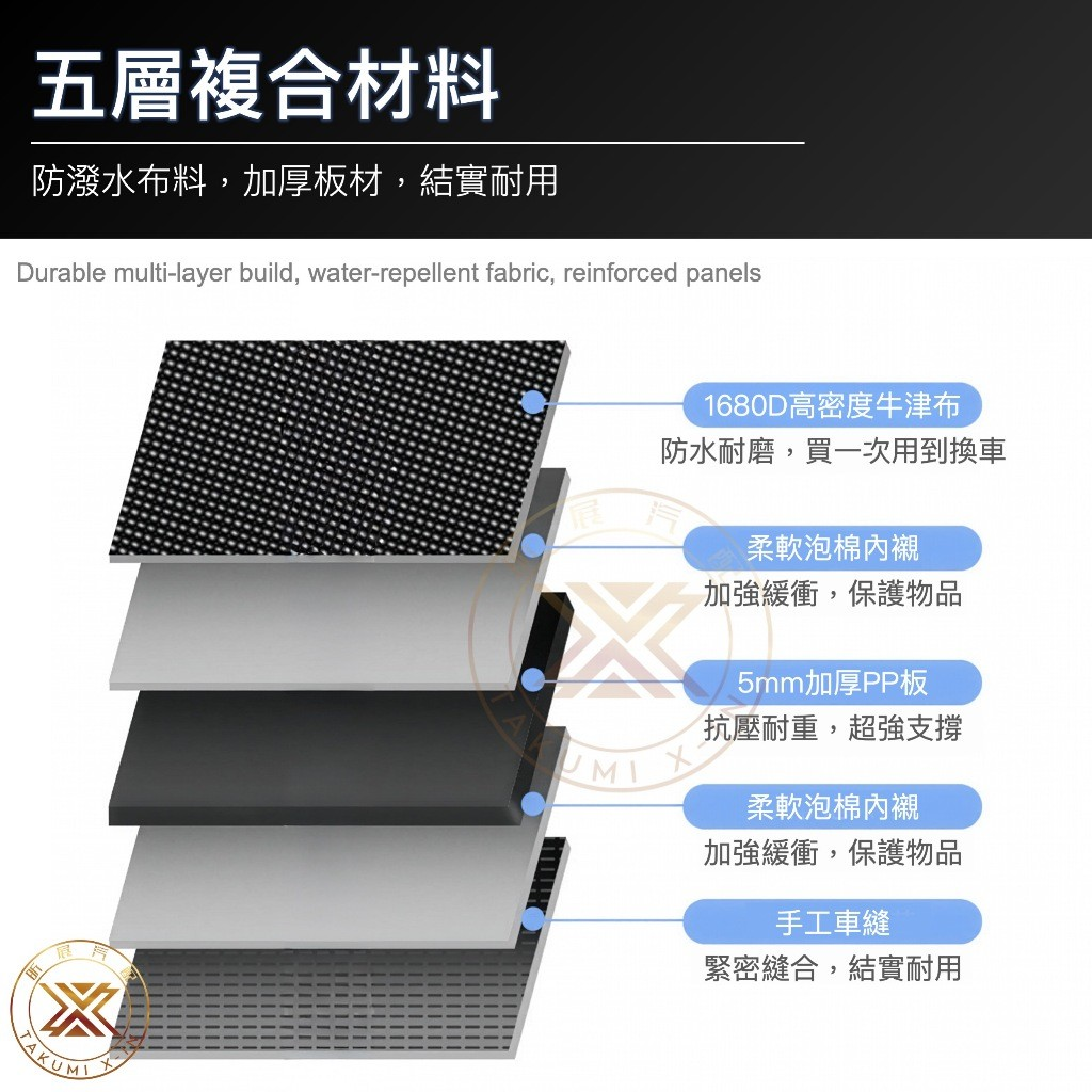 牛津布防潑水+皮革點綴+PP結構板 的「正經收納設備」。
