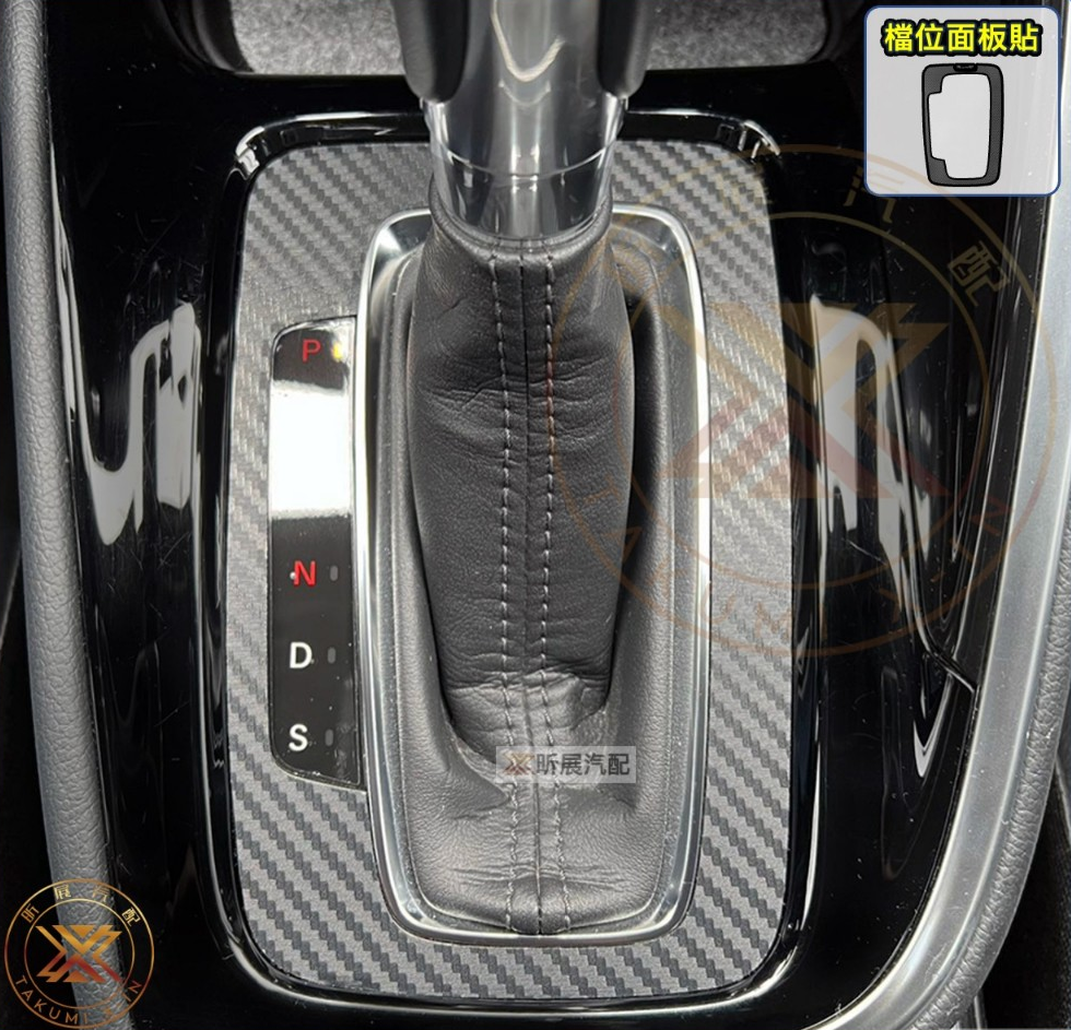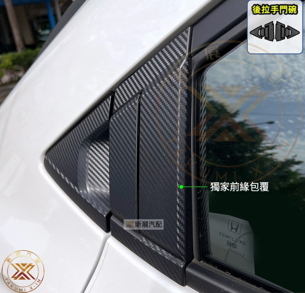 安裝的過程算是新手友善:清潔→脫脂→對位→撕背膠→從中間往外慢慢刮氣泡。中柱與後三角貼好之後,側面線條會先明顯升級;後門碗拉手貼上去,開門那一圈不再是單純塑膠;最後補上檔位面板,坐進駕駛座時會有「欸,這台車好像不太一樣了」的感覺。