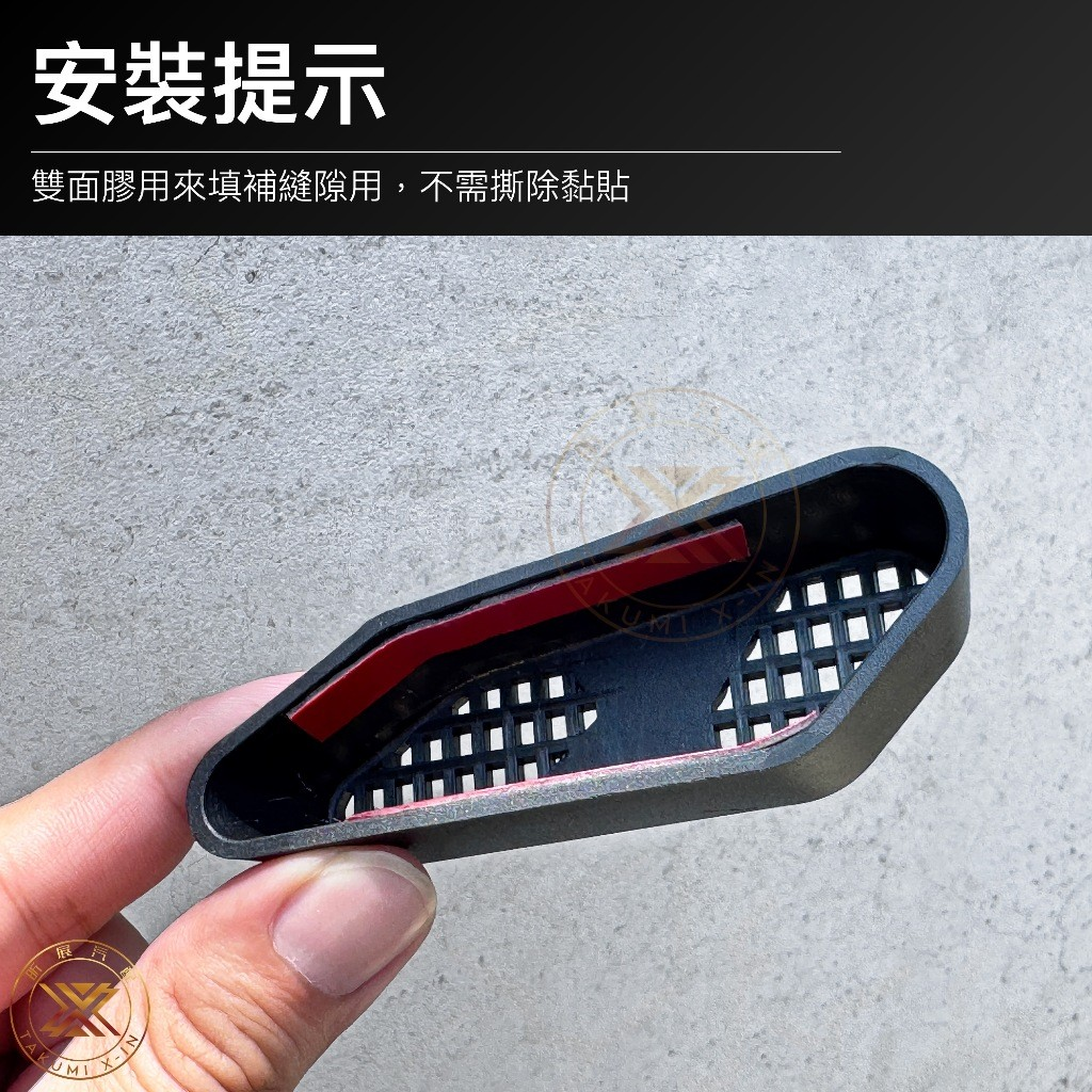 一組有左右各一個,依原車造型開模,材質是ABS硬質塑膠。內側貼有加厚雙面膠,但安裝是「卡入定位」即可,不用撕膠、不用工具,也不會傷到內裝,要拆下來清潔,一壓就解開。