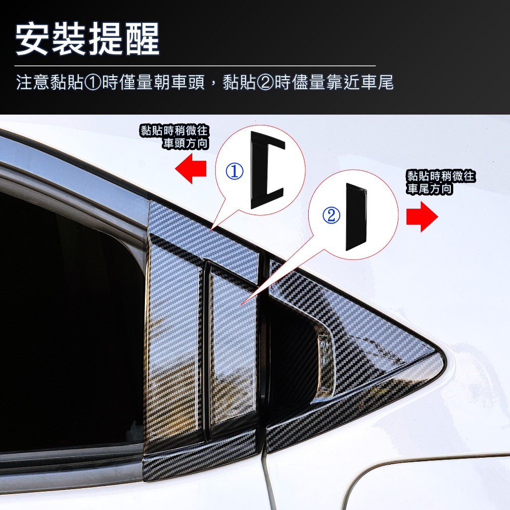 打開包裝是一組 6 件,左右後門各三片,外觀有鋼琴烤漆亮黑和碳纖紋兩種。我自己覺得鋼琴黑很像原廠高階版本,碳纖紋則是整個運動感拉滿,看車主個人風格選擇就好。